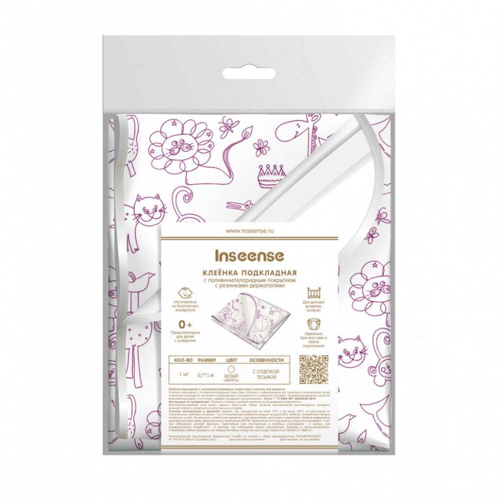 Клеёнка-наматрасник подкладная с ПВХ покр Inseense 0,7 x 1м с резинкой (белая с животными) (20) С