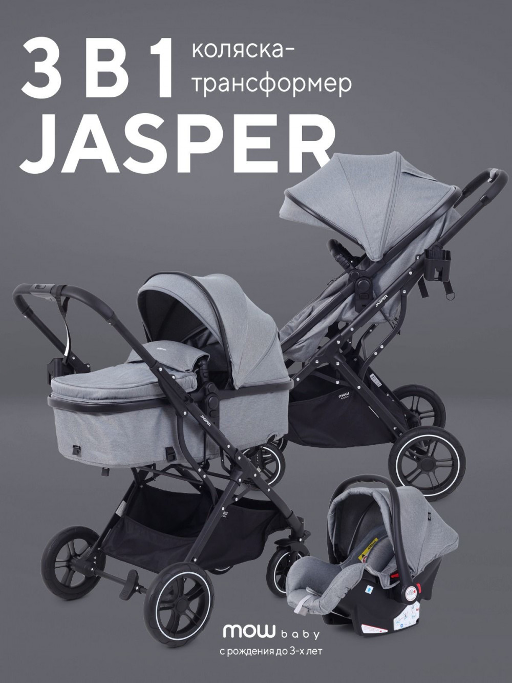 Коляска-трансформер MOWBaby Jasper MB022 3 в 1 Grey